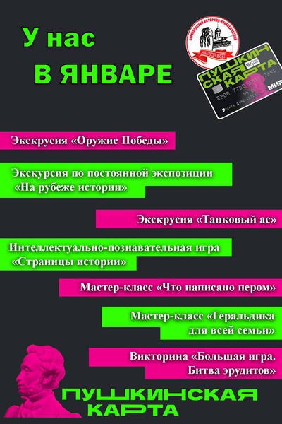 Дорогие друзья! Предлагаем вашему вниманию афишу мероприятий по Пушкинской карте на ЯНВАРЬ!