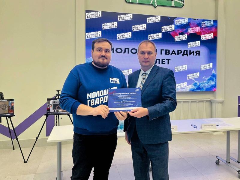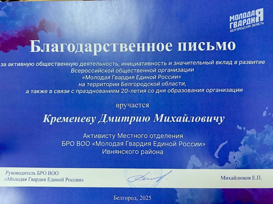 За активную общественную работу, инициативность и значительный вклад в развитие «Молодой гвардии Единой России» заведующий музеем Кременёв Д.М. был отмечен Благодарственным письмом Михайлюкова Е.П., руководителя Белгородского отделения «Молодой гвардии».