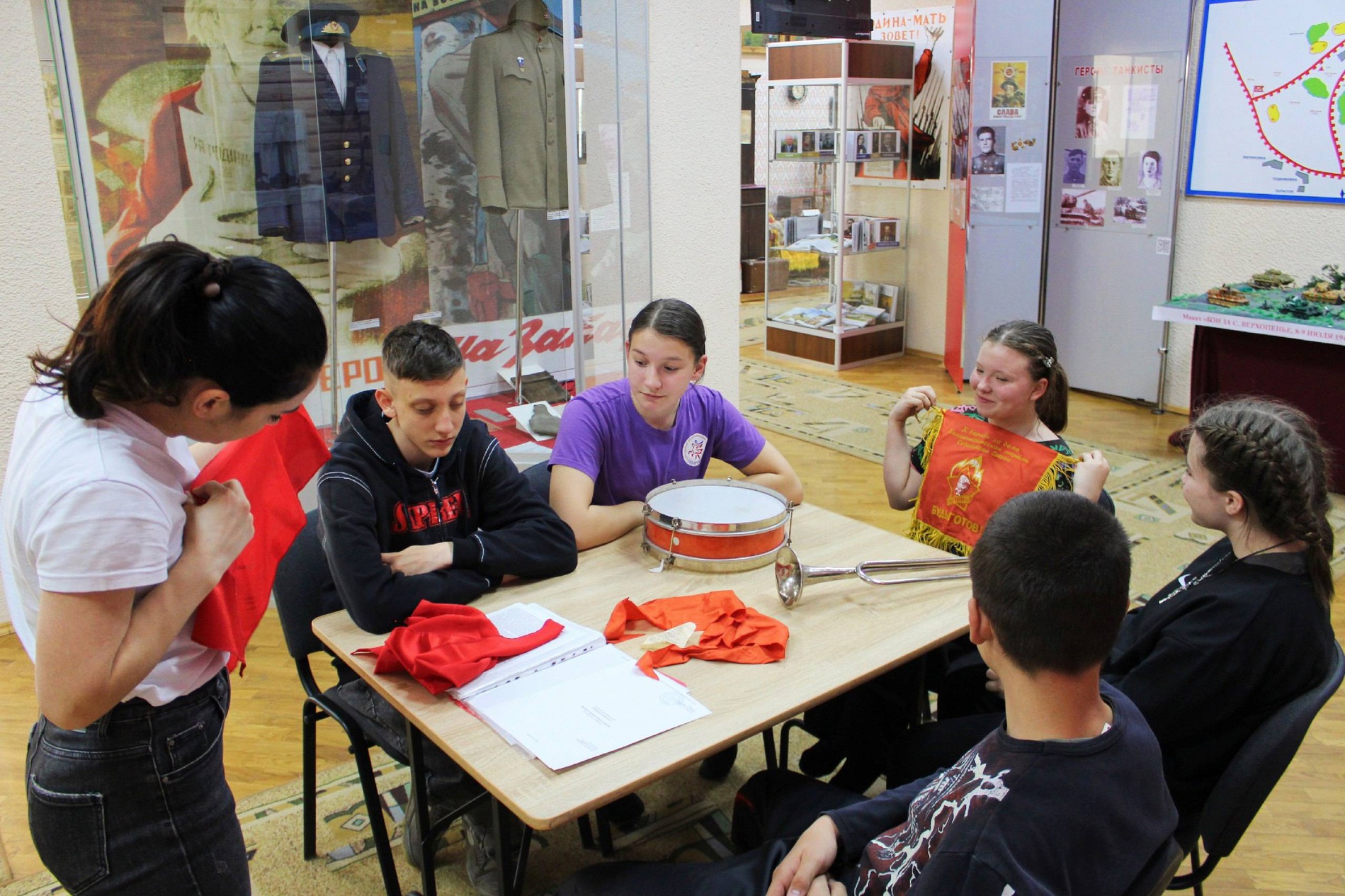 Члены клуба познакомились не только с историей создания пионерских отрядов, но и с атрибутикой. Также ребята почувствовали себя пионерами, примерив главный символ - пионерский галстук